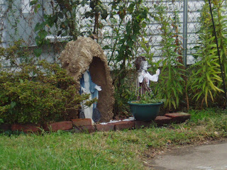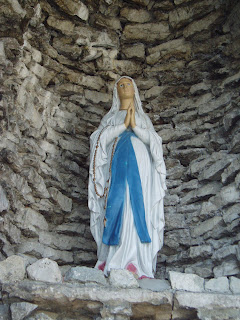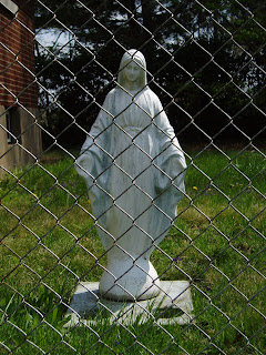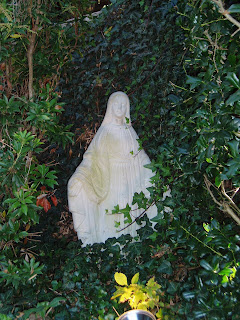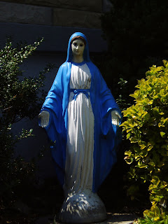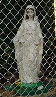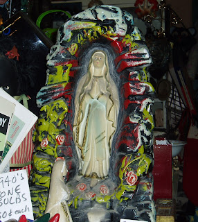 So she's not in a grotto-like shell, but she's still pretty cool. She's one of the few Marys who looks to be about 13, the approximate age of the real Mary (according to my Catholic school education) when she had Jesus. Also notice the cool neon-yellow snake at her feet.