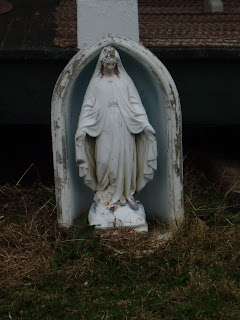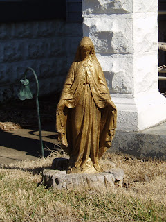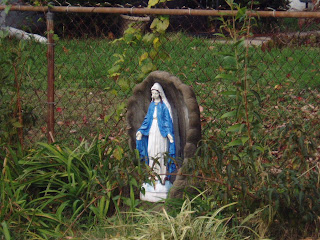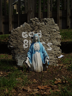 I found this Mary a while ago, when I first became interested in bathtub Marys. She lives in front of a house on one of the busiest streets in Louisville, in the midst of tattoo places and hipster bars. Maybe that's why she looks like she's hiding...she just wants a moment's peace. Or she wants to get away from the Jesus figure standing next to her. I couldn't get her face in this picture without going right into the yard. It had a fence around it, and I'm a little shy about these things.